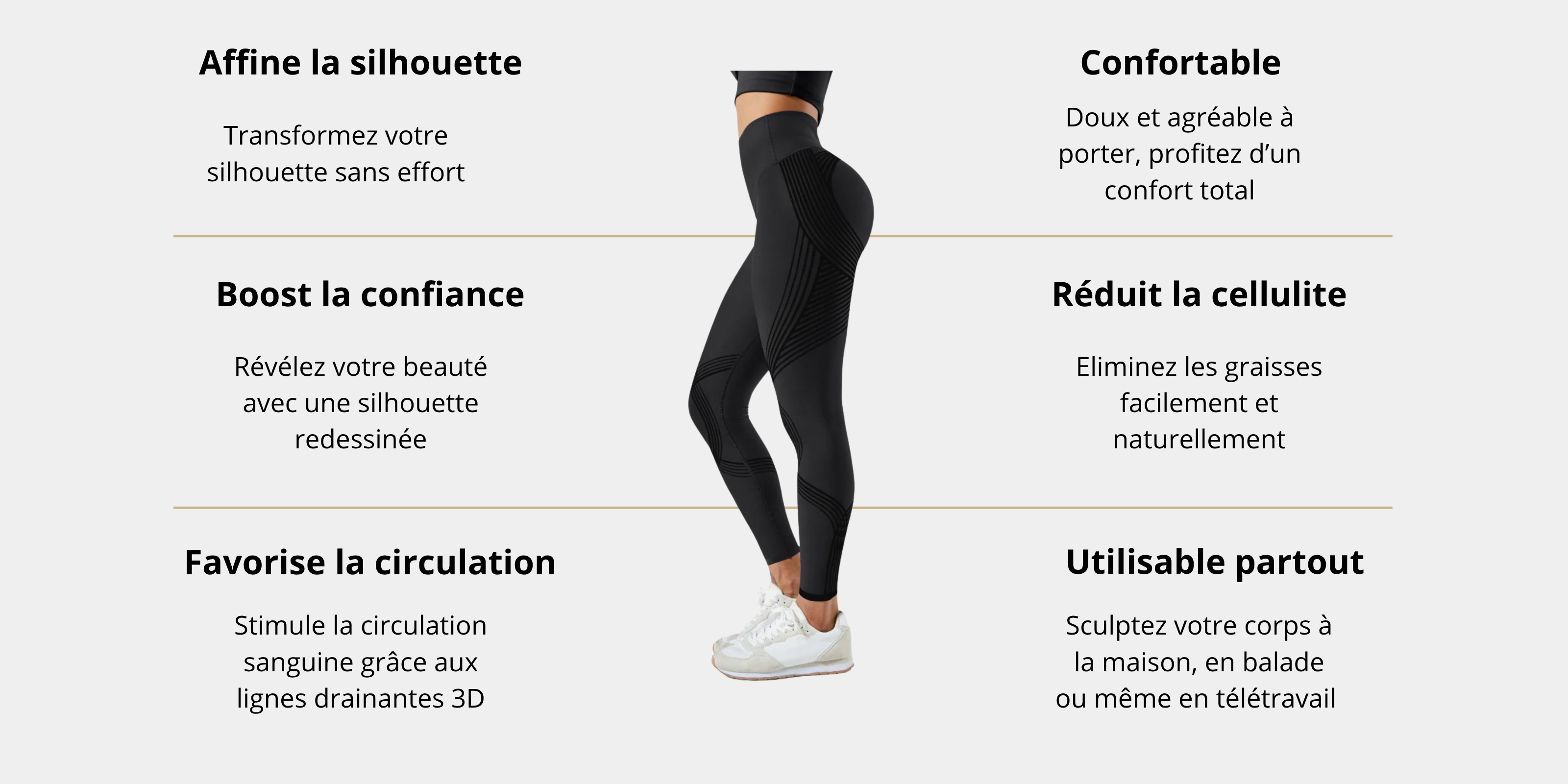 Dès qu’il est porté, le legging affine la taille et le ventre tout en sculptant harmonieusement les cuisses. Les fesses ne s’aplatissent pas : au contraire, elles sont galbées et raffermies pour un effet push-up naturel. La silhouette reste féminine, tonique et parfaitement équilibrée.